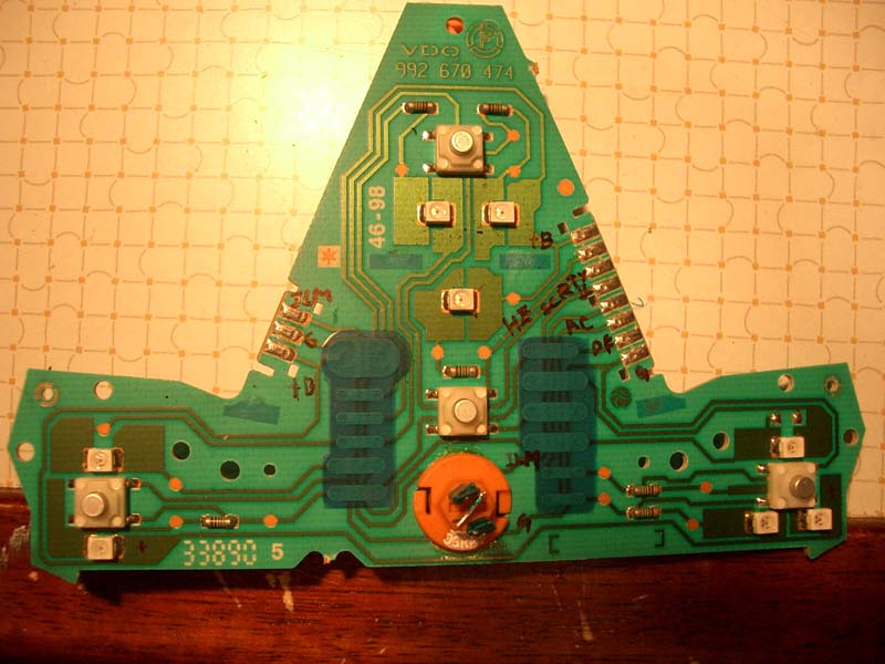 基板上に一杯ついてるチップLED・・・・。スイッチの機能イメージに合わせて色を変えてみっかな。。セキュリティー(イモビ)のとこの鍵マークのパイロットは・・・緑。エアコンだと冷たそうだから・・青・・(安直〜)。手持ちのチップLEDに付け替えて,試験点灯してみると・・・・・。あれ〜〜?。元々の黄色のLEDって暗いのねぇ。リアデフォッガの照明が殆ど見えん・・・・。でも,手元に黄色のチップLED在庫はないなぁ・・・・。ま,また今度ついでのときにでも。