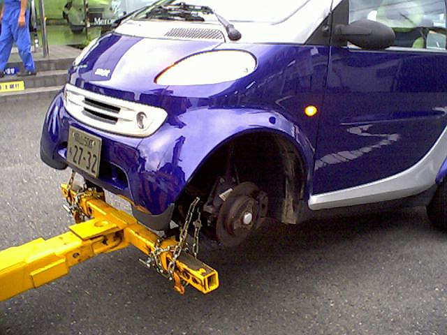 JAFが着いても,タイヤでは支えられないため,支え上げることもできず,タイヤを外して,左右のトランスバースリンクに爪を架けて持ち上げてもらいました。